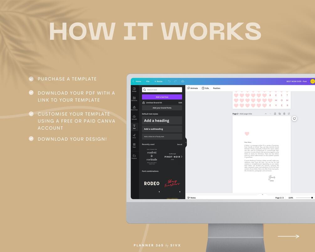 To use the template, simply open the file in Canva and add your own text or modify the existing design elements. You can change the text, font, and colours to create a unique and personalized postcard for your mom. Once you're happy with the design, you can download the file as a high-resolution JPEG or PDF and print it out at home or at your local print shop.